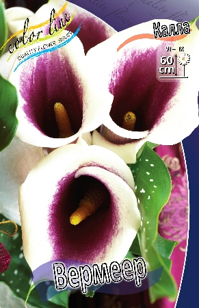 Калла Вермеер (Vermeer) - переливается атласным великолепием контрастов. Белая окантовка по пурпурному покрывалу слегка волнистых лепестков укрывает ярко-лимонный початок.Цветок белый с тёмно-лиловым пятном внутри бокала.