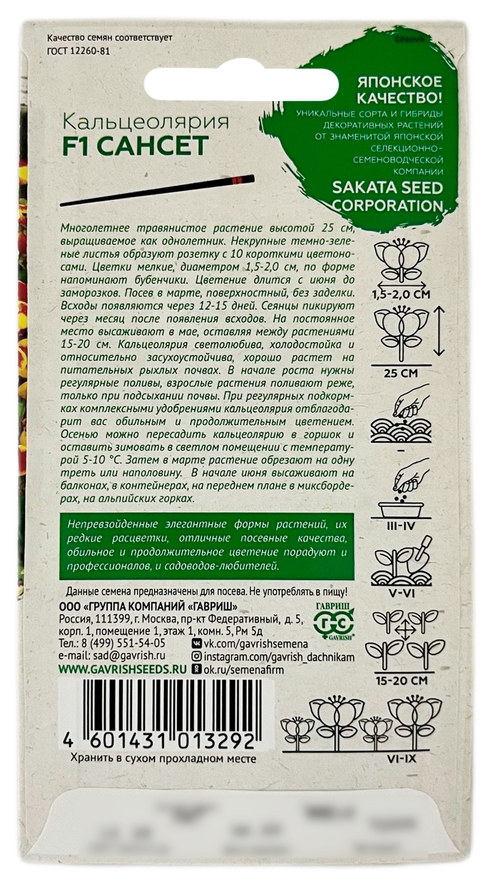 Кальцеолярия Сансет F1 ГАВРИШМноголетнее травянистое растение высотой 25-50 см, выращиваемое как летник. Некрупные кожистые темно-зеленые листья образуют розетку с 10 короткими цветоносами. Цветки мелкие, диаметром 1,5 - 2 см, по форме напоминают бубенчики. Цветение длится с июня до заморозков. Посев в марте, поверхностный, без заделки. Всходы появляются через 12-15 дней. Сеянцы пикируют через месяц после появления всходов. На постоянное место высаживают в мае, оставляя между растениями 15-20 см. Кальцеолярия светолюбива, холодостойка и относительно засухоустойчива, хорошо растет на питательных, рыхлых почвах. В начале роста нужны регулярные поливы, взрослые растения поливают реже, только при подсыхании почвы. При регулярных подкормках комплексными удобрениями кальцеолярия отблагодарит вас обильным и продолжительным цветением. Осенью можно пересадить кальцеолярию в горшок и оставить зимовать в светлом помещении с температурой 5-10 °C. Затем в марте растение обрезают на одну треть или наполовину. В начале июня высаживают на балконах, в контейнерах, на переднем плане в миксбордерах, на альпийских горках.