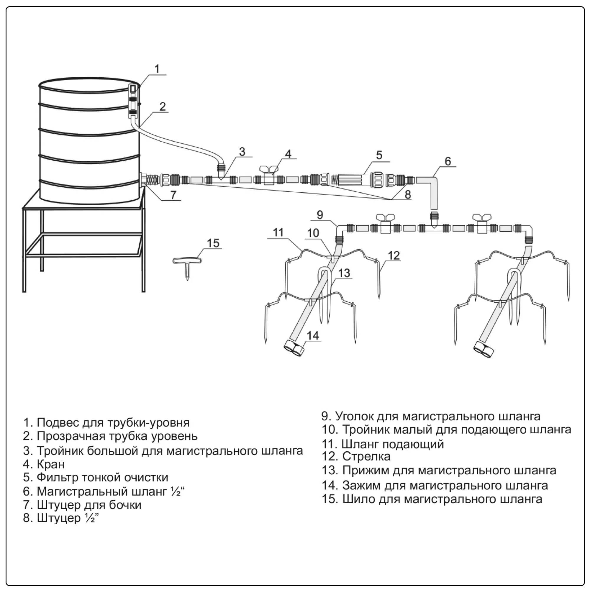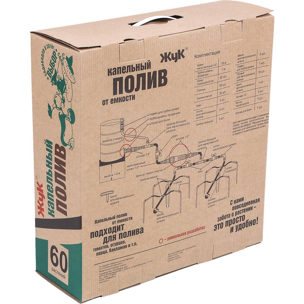 Капельный полив ЖУК от емкости 60 растений используется для полива растений в парниках и теплицах, а также на открытом грунте.Полив на 60 растений предназначен для полива до 18 м3 или на теплицу 3м*6м.
