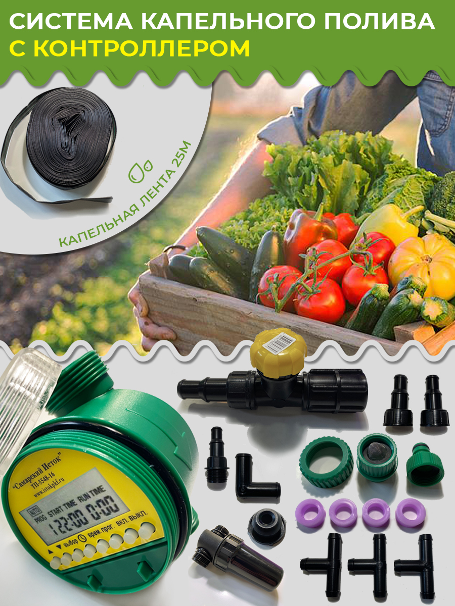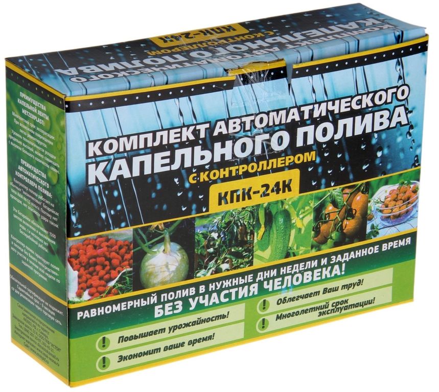 Комплект капельного полива с контроллером КПК-24К ТУ 22.21.29-034-10998229-2012 - предназначен для автоматического полива грядок на садово-огородных участках в открытом грунте и теплицах из накопительных емкостей для воды с условным давлением от 0,2-0,8 атм. Обеспечивает равномерный полив прикорневой области растений, экономит воду, создает максимально комфортные условия развития семян, рассады и взрослых растений.В системах капельного полива значимую роль играет капельная лента, которая на протяжении уже многих лет занимает лидирующее место на мировом рынке оборудования для гидросистем. Для капельной ленты не существует сложного участка ландшафта, она обеспечивает оптимизированный полив, позволяя существенно экономить расход водных ресурсов с одновременным повышением урожайности. Распределение воды происходит дозировано, при помощи ленточных капельниц.