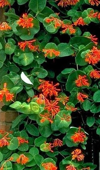 Наиболее эффектна жимолость Брауна именно во время цветения. Начинается цветение в июне-июле ( зависит от сорта и условий произрастания) и продолжается около месяца. После небольшой паузы цветение возобновляется в августе или сентябре и может продолжаться при благоприятных условиях до самых холодов.