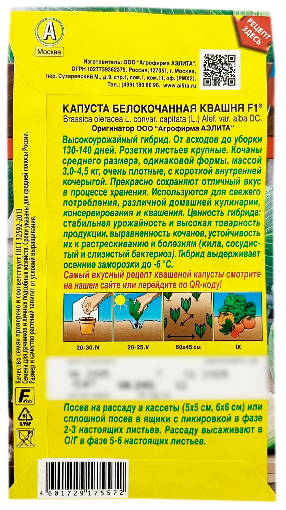 Капуста белокочанная КВАШНЯ F1 АЭЛИТАВысокоурожайный гибрид. От всходов до уборки 130-140 дней. Розетки листьев крупные. Кочаны среднего размера, одинаковой формы, массой 3,0-4,5 кг, очень плотные, с короткой внутренней кочерыгой. Прекрасно сохраняют отличный вкус в процессе хранения. Используются для свежего потребления, различной домашней кулинарии, консервирования и квашения. Ценность гибрида: стабильная урожайность и высокая товарность продукции, выравненность кочанов, устойчивость их к растрескиванию и болезням (кила, сосудистый и слизистый бактериоз). Гибрид выдерживает осенние заморозки до -6 °С.