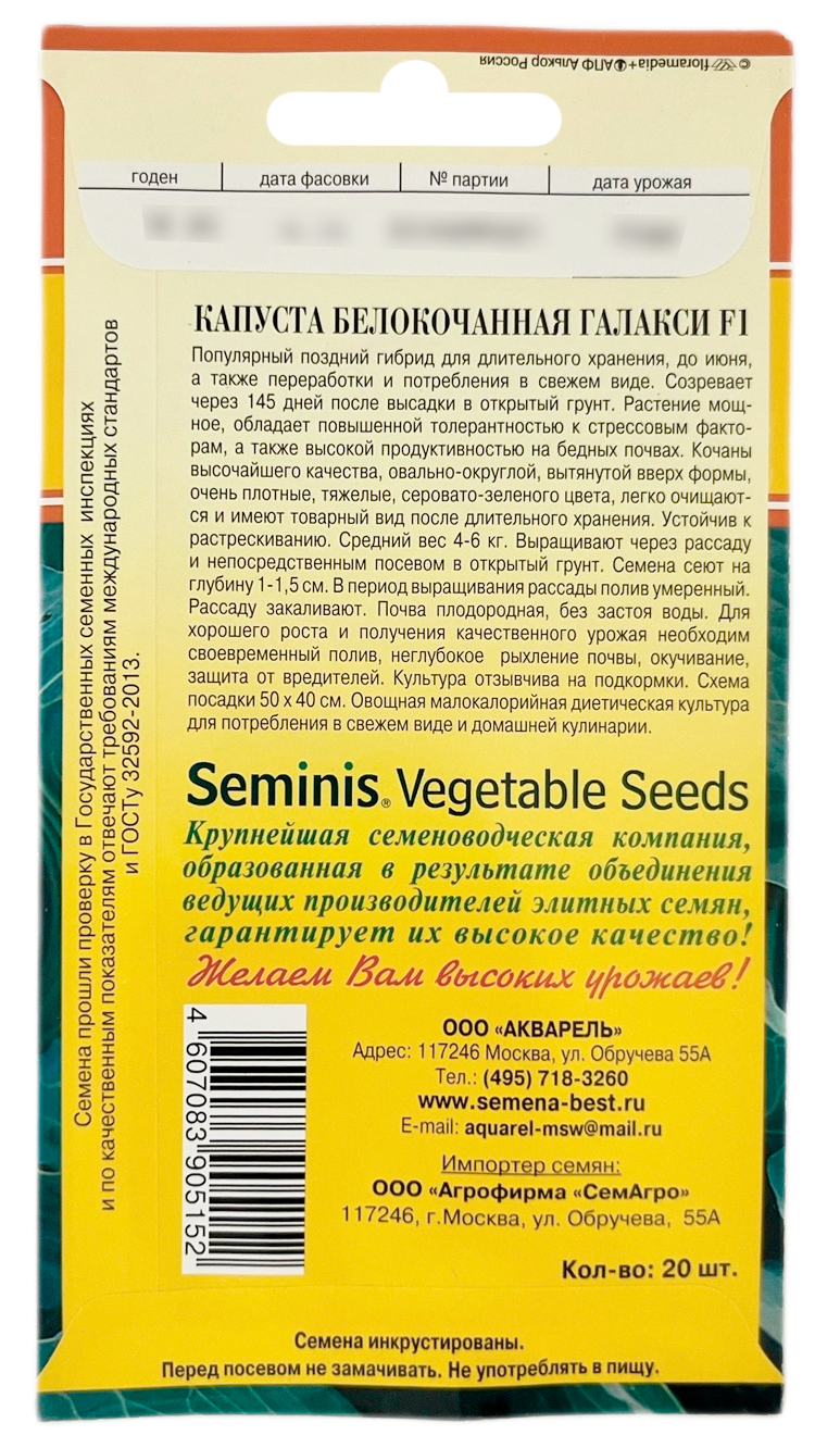 Капуста белокочанная Галакси F1Суперпопулярный в мире и в России гибрид для хранения . Очень мощный и высокоурожайный. Отличается высоким качеством кочанов, выносливостью, сильнорослым, мощным растением, устойчивостью к стрессам, толерантностью к трипсам и альтернариозу, высокой продуктивностью на бедных почвах. Созревает в среднем через 140 дней после пересадки. Кочаны массой 4-6 кг, высоко-округлой формы, серовато-зеленого цвета, очень плотные, тяжелые, легко очищаются и имеют привлекательный товарный вид после длительного хранения. В Голландии Галакси F1 был признан номером первым в списке гибридов, проходящих правительственные испытания, по показателям урожайности, длительности хранения и толерантности к трипсам в 1988 и 1989гг. Также он был признан лучшим гибридом по всем показателям в 1990г. на испытаниях в Нью-Йорке.