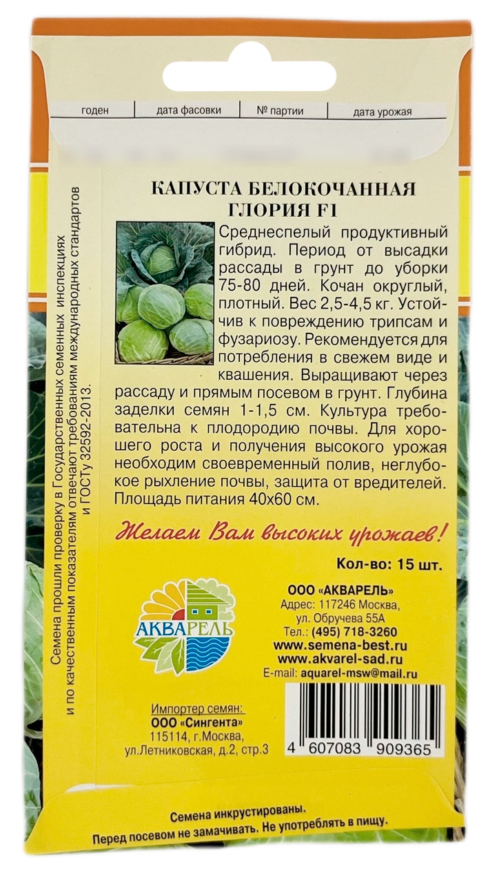 Капуста белокочанная Глория F1Среднеспелый продуктивный гибрид. Период от высадки рассады в грунт до уборки 75-80 дней. Кочан округлый, плотный. Вес 2,5-4,5 кг. Устойчив к повреждению трипсам и фузариозу. Рекомендуется для потребления в свежем виде и квашения. Выращивают через рассаду и прямым посевом в грунт. Глубина заделки семян 1-1,5 см. Культура требовательна к плодородию почвы. Для хорошего роста и получения высокого урожая необходим своевременный полив, неглубокое рыхление почвы, защита от вредителей. Площадь питания 40х60 см.