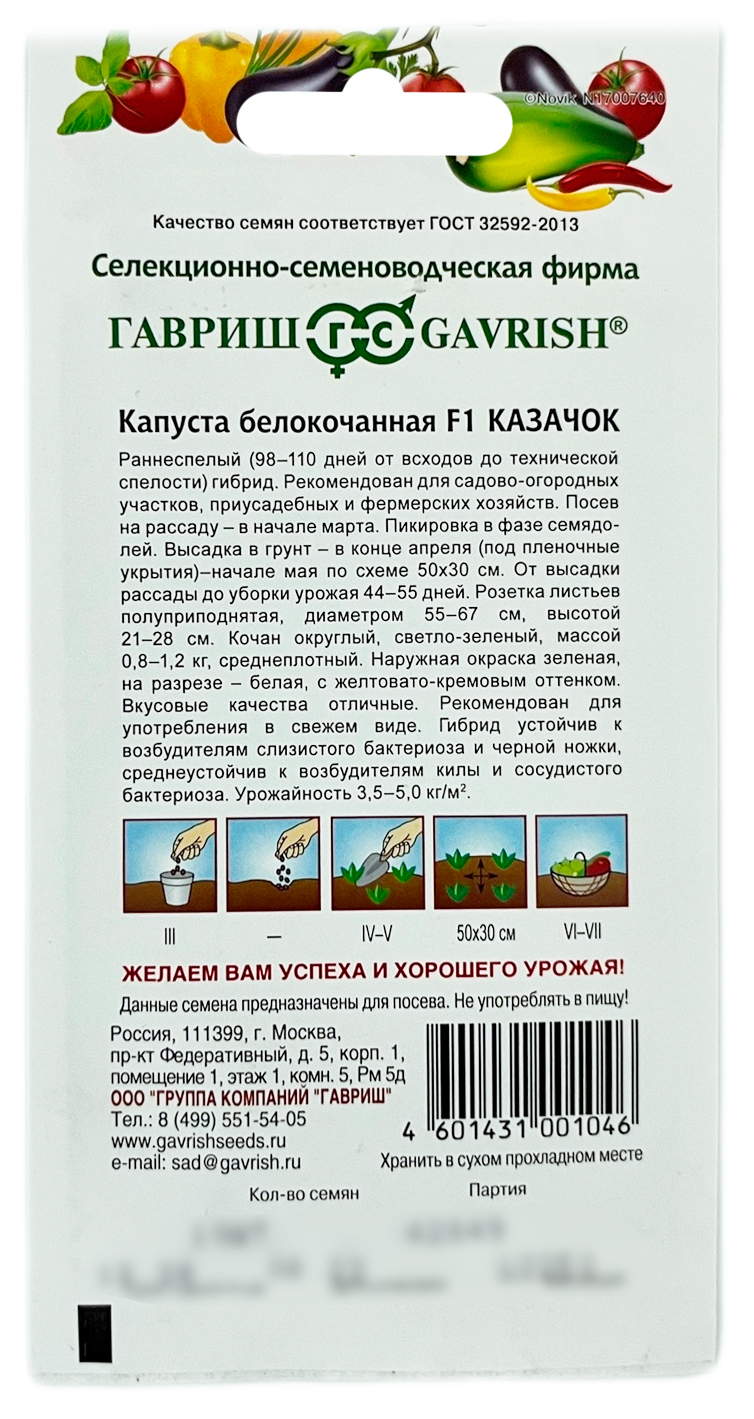 Капуста белокочанная КАЗАЧОК ГАВРИШРаннеспелый (98-110 дней от всходов до технической спелости) гибрид. Рекомендован для садово-огородных участков, приусадебных и фермерских хозяйств. Посев на рассаду в начале марта. Пикировка в фазе семядолей. Высадка в грунт в конце апреля (под пленочные укрытия) – начало мая по схеме 50х30 см. От высадки рассады до уборки урожая 44-55 дней.