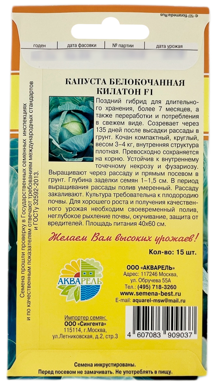 Капуста белокочанная Килатон F1Поздний гибрид для длительного хранения, более 7 месяцев, а также переработки и потребления в свежем виде. Созревает через 135 дней после высадки рассады в грунт. Кочан компактный, круглый, весом 3-4 кг, внутренняя структура плотная. Превосходно сохраняется на корню. Устойчив к внутреннему точечному некрозу и фузариозу. Выращивают через рассаду и прямым посевом в грунт. Глубина заделки семян 1-1,5 см. В период выращивания рассады полив умеренный. Рассаду закаливают. Культура требовательна к плодородию почвы. Для хорошего роста и получения качественного урожая необходим своевременный полив, неглубокое рыхление почвы, окучивание, защита от вредителей. Площадь питания 40х60 см. Капуста белокочанная невероятно богата всевозможными ценными и редкими полезными веществами. В ней находится высокое содержание витаминов, минералов, незаменимых и заменимых аминокислот, присутствуют полиненасыщенные и насыщенные жирные кислоты, фитостеролы. Особенно много витамина С, причем во время хранения он почти не разрушается. К тому же он хорошо сохраняется и в квашеной капусте.