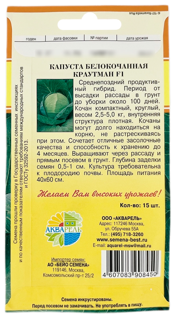 Капуста белокочанная Краутман F1Среднепоздний продуктивный гибрид. Период от высадки рассады в грунт до уборки около 100 дней. Кочан компактный, круглый, весом 2,5-5,0 кг, внутренняя структура плотная. Сохраняет товарный вид в поле длительное время, без растрескивания. Сочетает отличные засолочные качества и способность к хранению до 4 месяцев. Выращивают через рассаду и прямым посевом в грунт. Глубина заделки семян 0,5-1 см. Культура требовательна к плодородию почвы. Площадь питания 40x60 см.