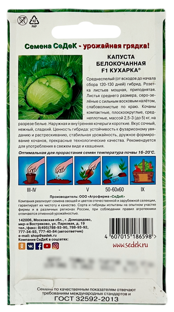 Капуста белокочанная КУХАРКА СеДеКСреднеспелый (от всходов до начала сбора 120-130 дней) гибрид. Розетка листьев мощная, приподнятая. Листья среднего размера, серо-зеленые с сильным восковым налетом, слабоволнистые по краю. Кочаны компактные, плоскоокруглые, среднеплотные, массой 2,5-3 (до 5) кг, на разрезе белые. Наружная и внутренняя кочерыга короткие. Вкус сочный, нежный, сладкий. Ценность гибрида: устойчивость к фузариозному увяданию и растрескиванию, стабильная урожайность, дружное формирование кочанов, прекрасные технологические качества. Рекомендуется для употребления в свежем виде и квашения.