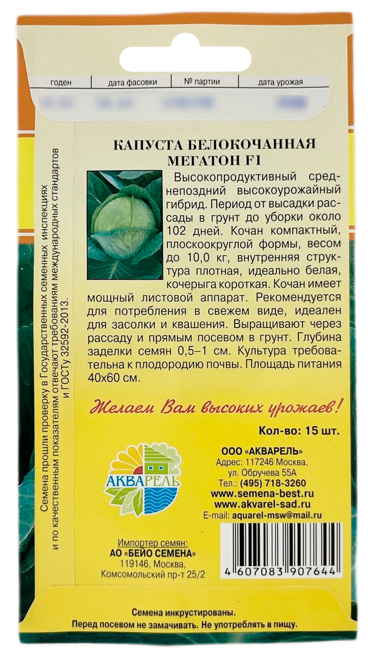 Капуста белокочанная Мегатон F1Высокопродуктивный средне-поздний высокоурожайный гибрид. Период от высадки рассады в грунт до уборки около 102 дней. Кочан компактный, плоскоокруглой формы, весом до 10,0 кг, внутренняя структура плотная, идеально белая, кочерыга короткая. Кочан имеет мощный листовой аппарат. Рекомендуется для свежевого потребления, идеален для засолки и квашения. Выращивают через рассаду и прямым посевом в грунт. Глубина заделки семян 0,5-1 см. Культура требовательна к плодородию почвы. Площадь питания 40x60 см.
