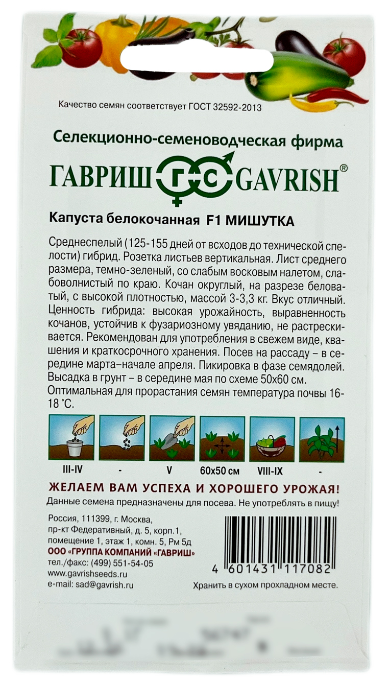 Капуста белокочанная МИШУТКА ГАВРИШСреднеспелый (125–155 дней от всходов до технической спелости) гибрид. Розетка листьев вертикальная. Лист среднего размера темно-зеленый со слабым восковым налетом, слабоволнистый по краю. Кочан округлый, на разрезе беловатый, с высокой плотностью, массой 3–3,3 кг. Вкус отличный. Ценность гибрида: высокая урожайность, выравненность кочанов, устойчив к фузариозному увяданию, не растрескивается.