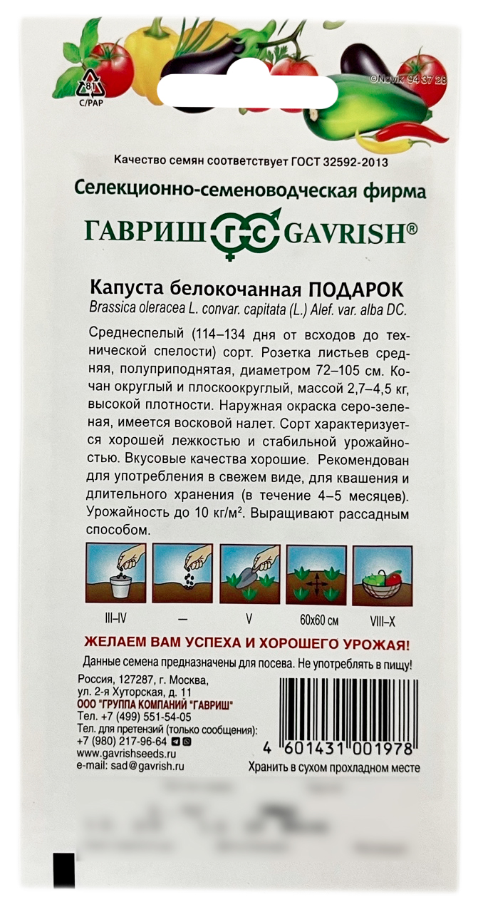 Капуста белокочанная ПОДАРОК ГАВРИШСреднеспелый (114-134 дня от всходов до технической спелости) сорт. Посев на рассаду в середине марта – начале апреля. Пикировка в фазе семядолей. Высадка в грунт в середине мая по схеме 50х30 см. Розетка листьев средняя, полуприподнятая, диаметром 72-105 см. Кочан круглый и плоскоокруглый, массой 2,7-4,4 кг, высокой плотности. Наружная окраска серо-зеленая, имеется восковой налет. Сорт характеризуется хорошей лежкостью и стабильной урожайностью. Вкусовые качества хорошие. Рекомендован для потребления в свежем виде, для квашения и длительного хранения (в течение 4-5 месяцев). Урожайность до 10 кг/м2.