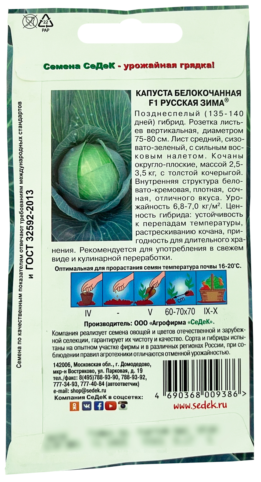 Капуста белокочанная Русская ЗимаПоздний гибрид белокочанной капусты Русская зима F1. Период созревания от всходов до сбора урожая от 135 до 140 дней. Растение отзывчиво на удобрения и даёт отличный урожай. Кочан среднего размера, плотный, зелёного цвета с восковым налётом, сочного вкуса, устойчив к растрескиванию. Вес одной капусты в зрелом виде до 3,5 кг. Обладает высокими вкусовыми качествами и хорошей устойчивостью к различным видам заболевания. Пригодна для продолжительного, зимнего хранения. Идеально подходит для засолки, квашения и приготовления различных блюд. Подходит для профессионального выращивания на продажу.