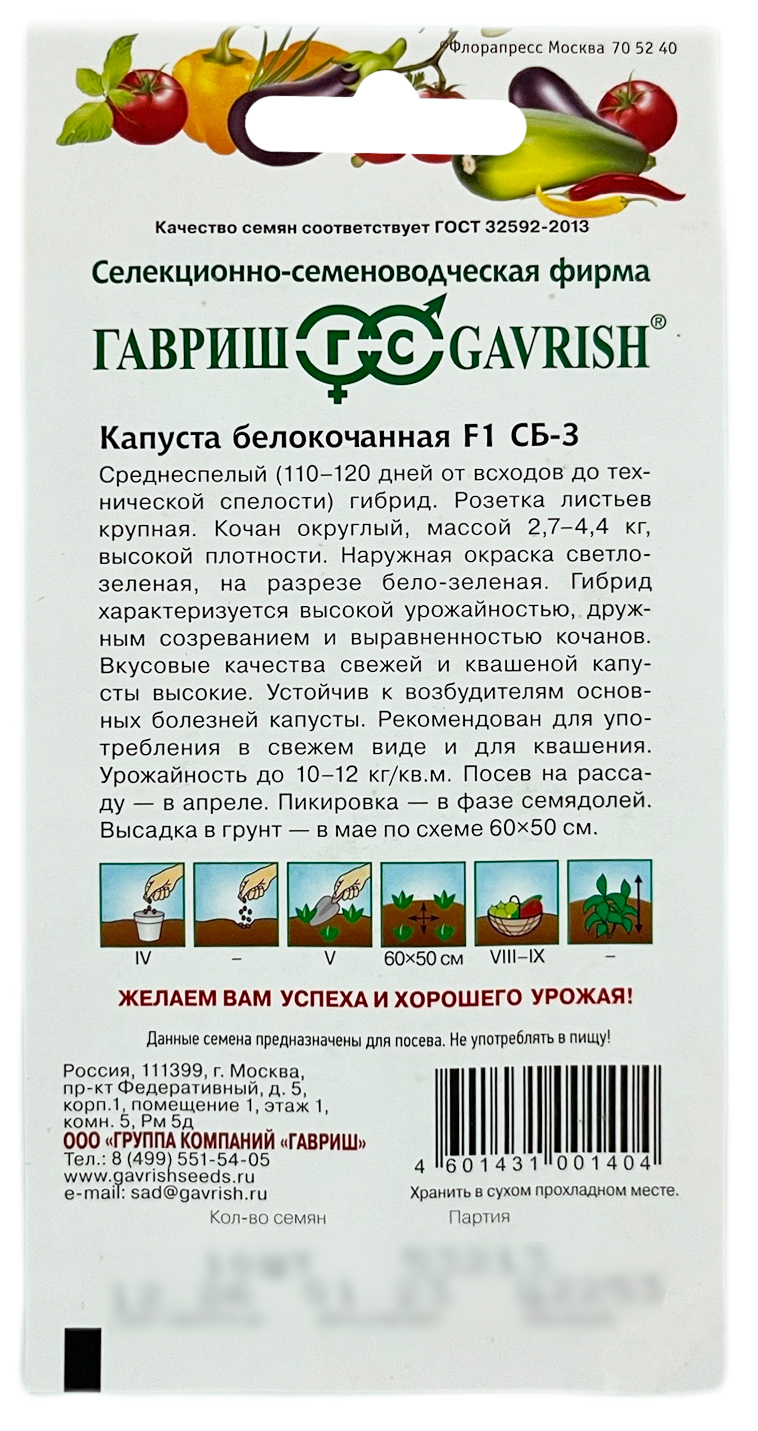 Капуста белокочанная СБ 3 ГАВРИШСреднеспелый (110-120 дней от всходов до технической спелости) гибрид. Посев на рассаду в апреле. Пикировка-в фазе семядолей. Высадка в грунт в мае по схеме 60х50 см. Розетка листьев крупная. Кочан округлый, массой 2,7-4,4 кг, высокой плотности. Наружная окраска светло-зеленая, на разрезе бело-зеленая. Гибрид характеризуется высокой урожайностью, дружным созреванием и выравненностью кочанов. Вкусовые качества свежей и квашеной капусты высокие. Устойчив к возбудителям основных болезней капусты. Рекомендован для употребления в свежем виде и для квашения. Урожайность до 10-12 кг/м2.