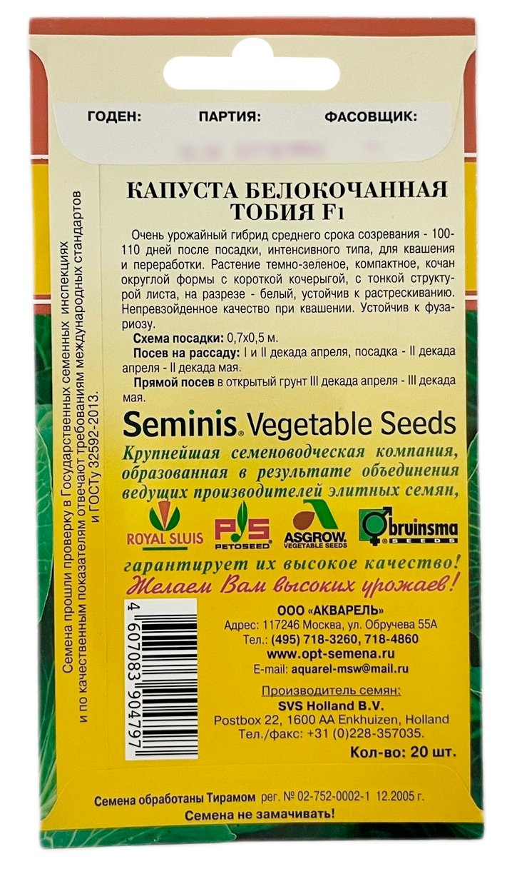 Капуста белокочанная Тобия F1 АКВАРЕЛЬОчень урожайный гибрид среднего срока созревания -100-110 дней после посадки, интенсивного типа, для квашения и переработки. Растениетемно-зеленое, компактное, кочан округлой формы с короткой кочерыгой, с тонкой структурой листа, на разрезе - белый, устойчив к растрескиванию. Непревзойденное качество при квашении. Устойчив к фузариозу.