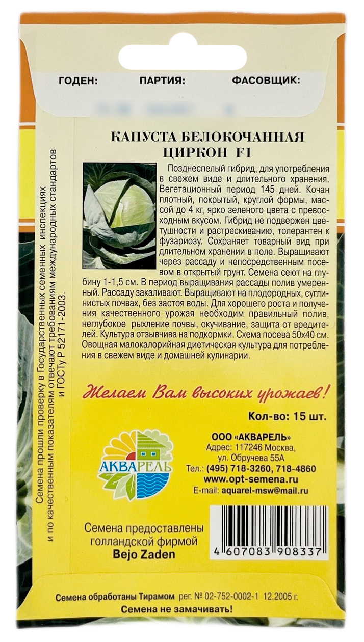 Капуста белокочанная Циркон F1Позднеспелый гибрид, для употребления в свежем виде и длительного хранения. Вегетационный период 145 дней. Кочан плотный, покрытый, круглой формы, массой до 4 кг, ярко зеленого цвета с превосходным вкусом. Гибрид не подвержен цветушности и растрескиванию, толерантен к фузариозу. Сохраняет товарный вид при длительном хранении в поле. Выращивают через рассаду и непосредственным посевом в открытый грунт. Семена сеют на глубину 1-1,5 см. В период выращивания рассады полив умеренный. Рассаду закаливают. Выращивают на плодородных, суглинистых почвах, без застоя воды. Для хорошего роста и получения качественного урожая необходим правильный полив, неглубокое рыхление почвы, окучивание, защита от вредителей. Культура отзывчива на подкормки. Схема посева 50 х 40 см. Овощная малокалорийная диетическая культура для потребления в свежем виде и домашней кулинарии.