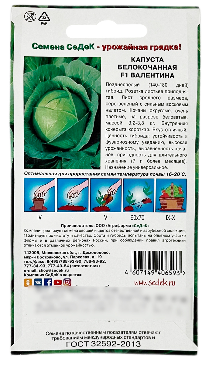 Капуста белокочанная ВАЛЕНТИНА СеДеКПозднеспелый (140-180 дней) гибрид. Розетка листьев приподнятая. Лист среднего размера, серо-зеленый с сильным восковым налетом. Кочаны округлые, очень плотные, на разрезе беловатые, массой 3,2-3,8 кг. Внутренняя кочерыга короткая. Вкус отличный. Ценность гибрида: устойчивость к фузариозному увяданию, высокая урожайность, выравненность кочанов, пригодность для длительного хранения (7 и более месяцев). Назначение универсальное.