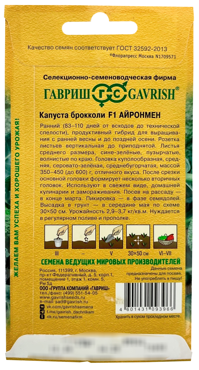 Капуста брокколи Айронмен F1Среднеранний (83-110 дней от всходов до технической спелости), продуктивный гибрид для выращивания с ранней весны и до поздней осени. Розетка листьев вертикальная до приподнятой. Листья среднего размера, сине-зелёные, пузырчатые, волнистые по краю. Головка куполообразная, средняя, серовато-зелёная, среднебугорчатая, массой 350-450 (до 600) г, отличного вкуса. После срезки основной головки формирует несколько вторичных головок. Используют в свежем виде, домашней кулинарии и замораживания. Посев на рассаду — в конце марта. Пикировка — в фазе семядолей. Высадка в грунт — в середине мая по схеме 30х50 см. Урожайность 2,9-3,7 кг/кв.м. Нуждается в регулярном поливе и прополке.