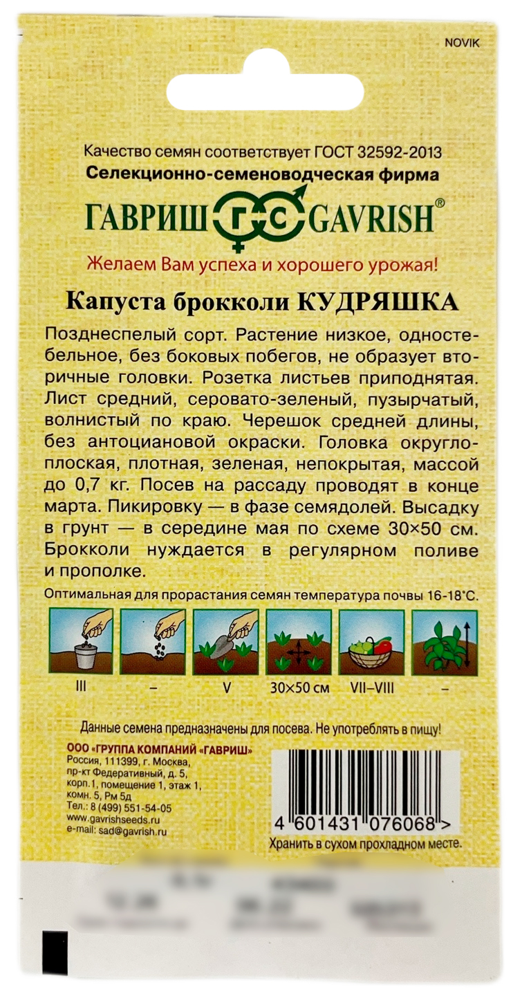Капуста брокколи КудряшкаПозднеспелый сорт. Растение низкое, одностебельное, без боковых побегов, не образует вторичные головки. Розетка листьев приподнятая. Лист средний, серовато-зеленый, пузырчатый, волнистый по краю. Черешок средней длины, без антоциановой окраски. Головка округло-плоская, плотная, зеленая, массой 0,6-0,7 кг. Рекомендован для домашней кулинарии и консервирования. Посев на рассаду проводят в конце марта. Пикировку - в фазе семядолей. Высадку в грунт - в середине мая по схеме 30х50 см. Нуждается в регулярном поливе и прополке.