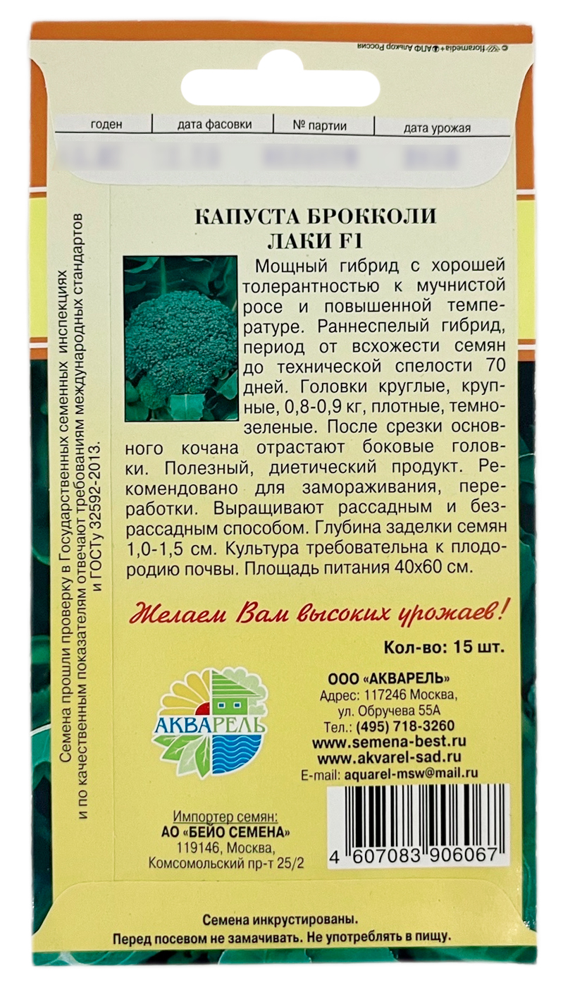 Капуста брокколи Лаки F1Раннеспелый гибрид, период от всхожести до спелости 70 дней, с гладкими куполообразными головками среднего размера, масса 0,8-0,9кг, с хорошей устойчивостью к мучнистой росе и высоким температурам.