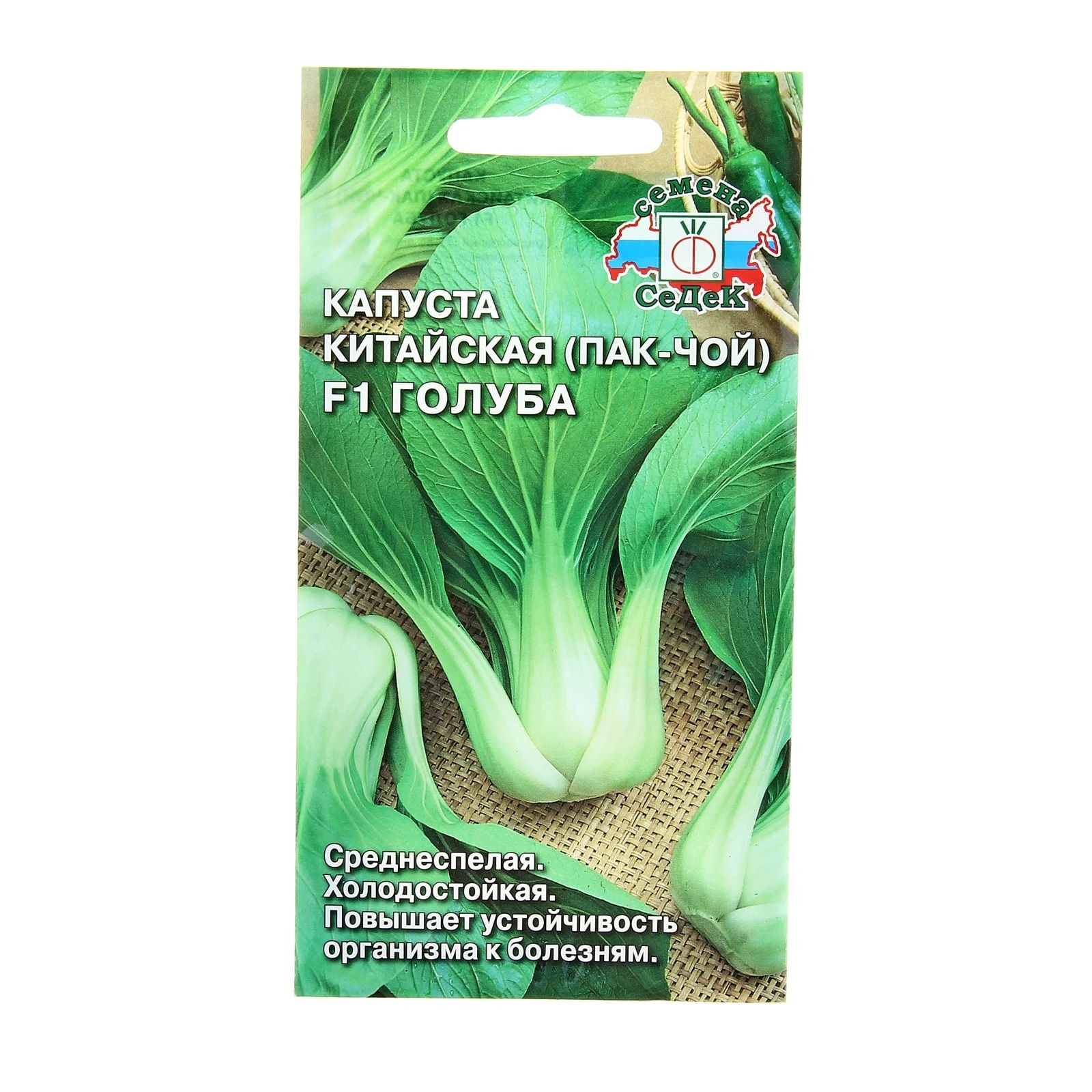 Капуста Голуба F1 (пак-чой)Среднеспелый (75-85 дней) гибрид для ранневесеннего и летне-осеннего выращивания в открытом и защищенном грунте. Розетка листьев мощная, прямостоячая, с широкими сомкнутыми, светло-зелеными черешками листьев. Листья округлые, тёмно-зелёные. Масса одного растения 1-1,5 кг. Вкусовые качества хорошие. Сбор урожая производится по мере роста растения. Ценность гибрида: холодостойкость и теневыносливость, мало поражается болезнями, длительно сохраняет товарные качества. Способствует повышению устойчивости организма к болезням. Рекомендуется для приготовления корейско-китайских салатов «кимча», употребляется в варёном и тушёном виде.