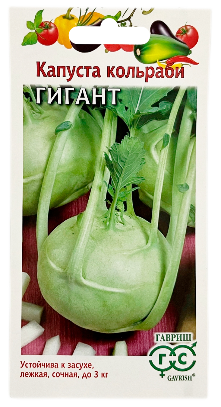 Капуста кольраби ГИГАНТ ГАВРИШПозднеспелый (90-100 дней от всходов до технической спелости) сорт. Посев на рассаду в конце марта - начале апреля. Пикировка в фазе семядолей. Высадка рассады в грунт в мае по схеме 50х20см. Розетка полувертикальная, крупная, диаметром 60 см. Стеблеплод крупный, массой 2,5-3,0 г, диаметром 15-20 см, округлый. Окраска белесо-зеленоватая, с вогнутой вершиной. Вкусовые качества хорошие, мякоть нежная, сочная. Сорт характеризуется стабильной урожайностью, высокой лежкоспособностью, жаро- и засухоустойчивостью. Рекомендован для потребления в свежем виде и для переработки.