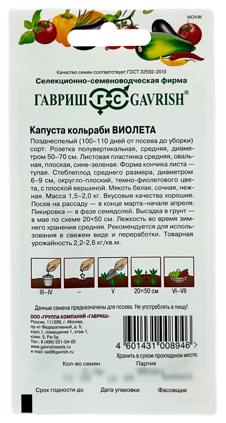 Капуста кольраби ВИОЛЕТА ГАВРИШПозднеспелый (100-110 дней от посева до уборки) сорт. Розетка полувертикальная, средняя, диаметром 50-70 см. Листовая пластинка средняя, овальная, плоская, сине-зеленая. Форма кончика листа - тупая. Стеблеплод среднего размера, диаметром 6-9 см, округло-плоский, темно-фиолетового цвета, с плоской вершиной. Мякоть белая, сочная, нежная. Масса 1,5-2,0 кг. Вкусовые качества хорошие. Посев на рассаду - в конце марта - начале апреля. Пикировка в фазе семядолей. Высадка в грунт в мае по схеме 20х50 см. Лежкость во время зимнего хранения средняя. Рекомендуется для использования в свежем виде и переработки. Товарная урожайность 2,2-2,6 кг/м2.