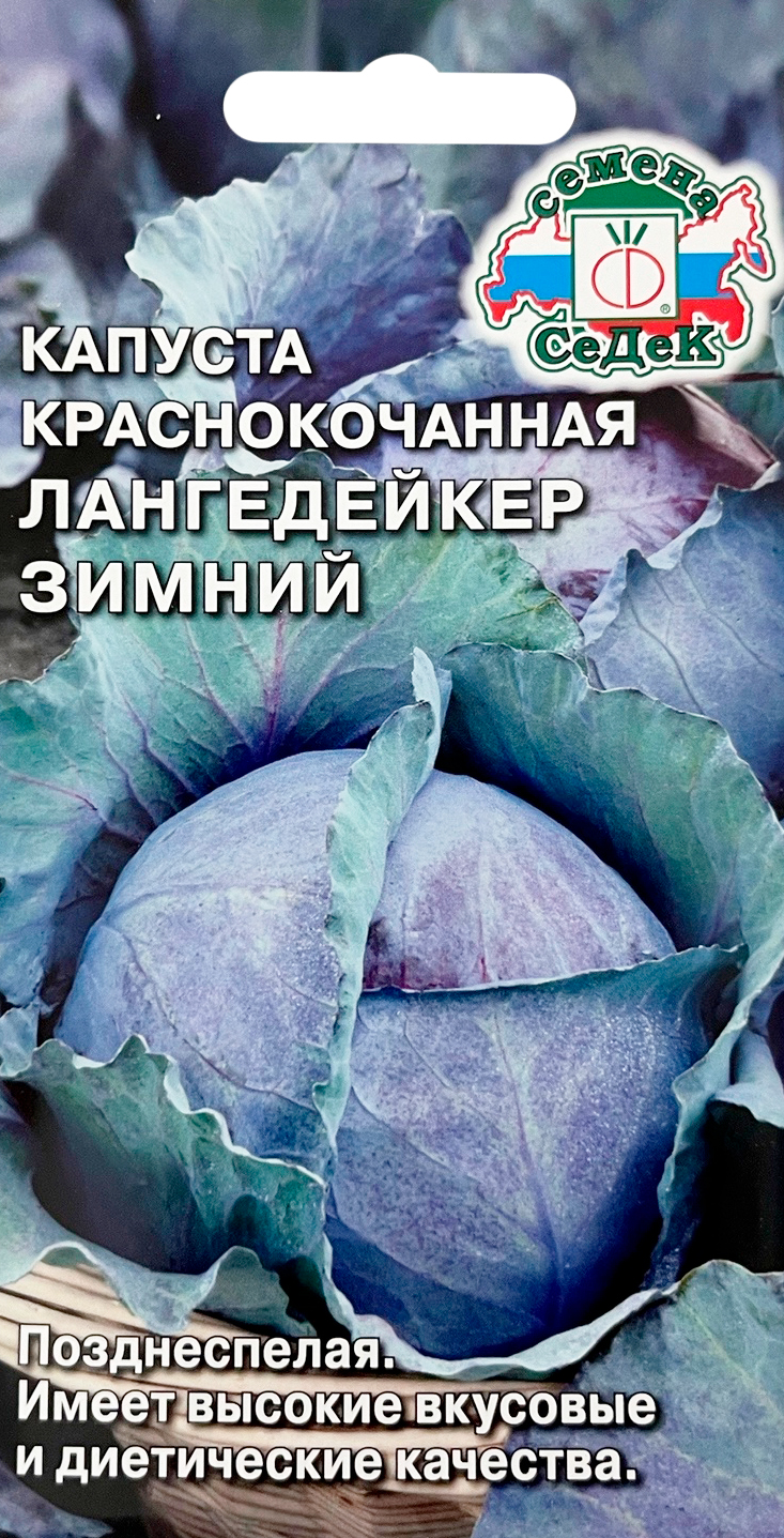 Капуста Лангедейкер ЗимнийПозднеспелый (от всходов до технической спелости 125-145 дней) сорт. Розетка листьев приподнятая. Лист среднего размера, фиолетовый с восковым налетом. Кочан округлый, плотный, массой 2,5-3,2 кг. Кочерыжка маленькая. Вкусовые качества высокие. Ценность сорта: выравненность кочанов, пригодность для длительного хранения, сохранение товарного вида. Рекомендуется для употребления в свежем виде и переработки.