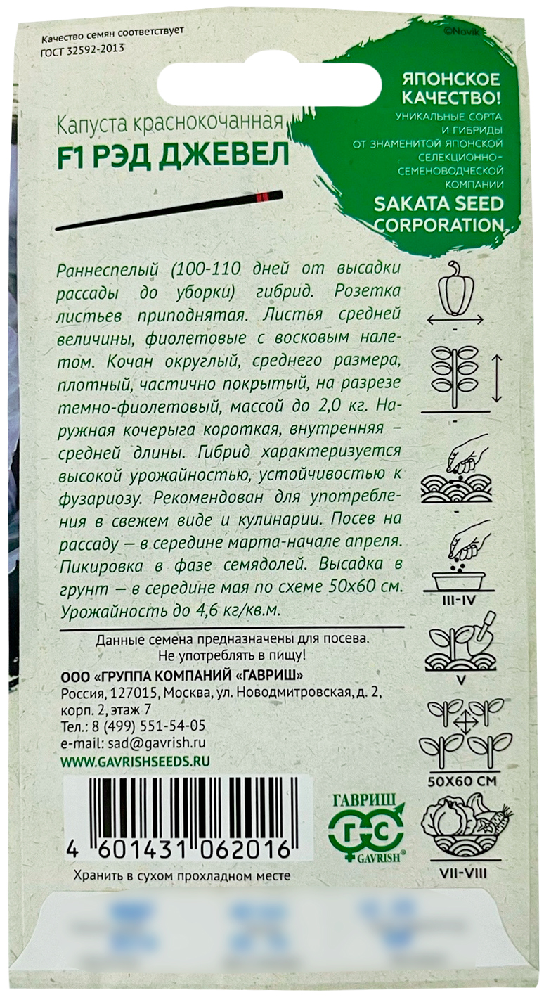 Капуста краснокочанная Рэд Джевел F1 ГАВРИШРаннеспелый (100-110 дней от высадки рассады до уборки) гибрид. Розетка листьев приподнятая. Листья средней величины, фиолетовые с восковым налетом. Кочан округлый, среднего размера, плотный, частично покрытый, на разрезе темно-фиолетовый, массой до 2,0 кг. Наружная кочерыга короткая, внутренняя – средней длины. Гибрид характеризуется высокой урожайностью, устойчивостью к фузариозу. Рекомендован для потребления в свежем виде и кулинарии. Посев на рассаду - в середине марта – начале апреля. Пикировка в фазе семядолей. Высадка в грунт в середине мая по схеме 50х60 см. Урожайность до 4,6 кг/кв.м.