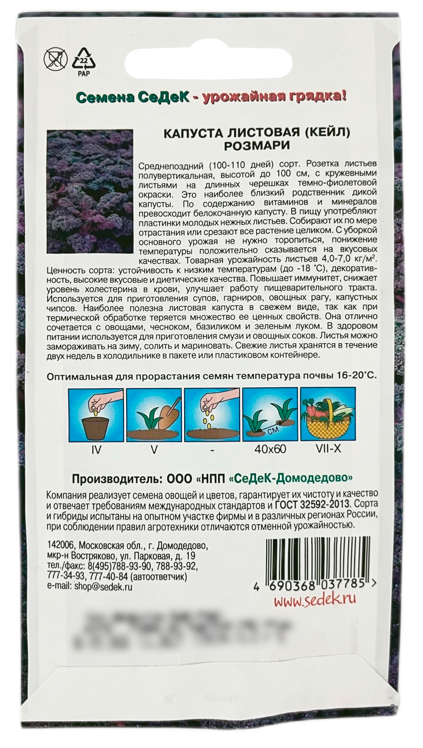 Капуста листовая РОЗМАРИ СеДеКСреднепоздний (100-110 дней) сорт. Розетка листьев полувертикальная, высотой до 100 см, с кружевными листьями на длинных черешках темно-фиолетовой окраски. Это наиболее близкий родственник дикой капусты. По содержанию витаминов и минералов превосходит белокочанную капусту. В пищу употребляют пластинки молодых нежных листьев. Собирают их по мере отрастания или срезают все растение целиком. С уборкой основного урожая не нужно торопиться, понижение температуры положительно сказывается на вкусовых качествах. Товарная урожайность листьев 4,0-7,0 кг/м2.
