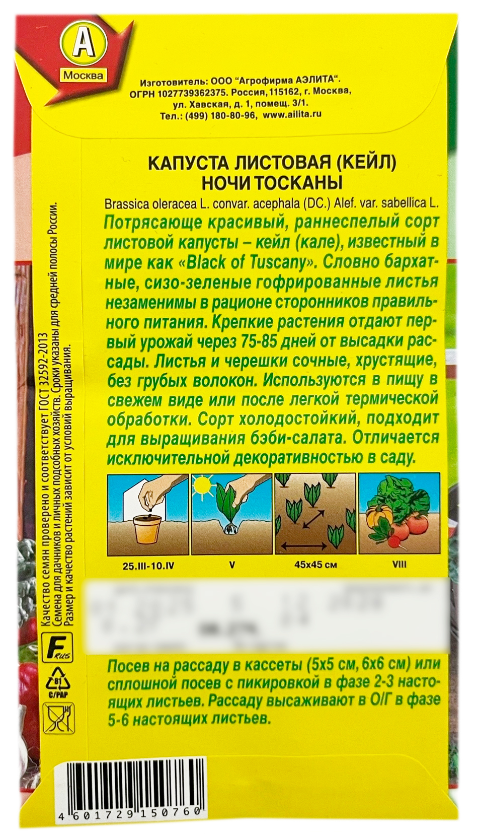 Капуста листовая КЕЙЛ НОЧИ ТОСКАНЫ АЭЛИТАПотрясающе красивый, раннеспелый сорт листовой капусты (кале), известный в мире как Black of Tuscany. Словно бархатные, сизо-зеленые, гофрированные листья незаменимы в рационе сторонников правильного питания. Крепкие растения отдают первый урожай через 75-85 дней от высадки рассады. Листья и черешки сочные, хрустящие, без грубых волокон. Используются в пищу в свежем виде или после легкой термической обработки. Сорт холодостойкий, подходит для выращивания бэби-салата. Отличается исключительной декоративностью в саду.