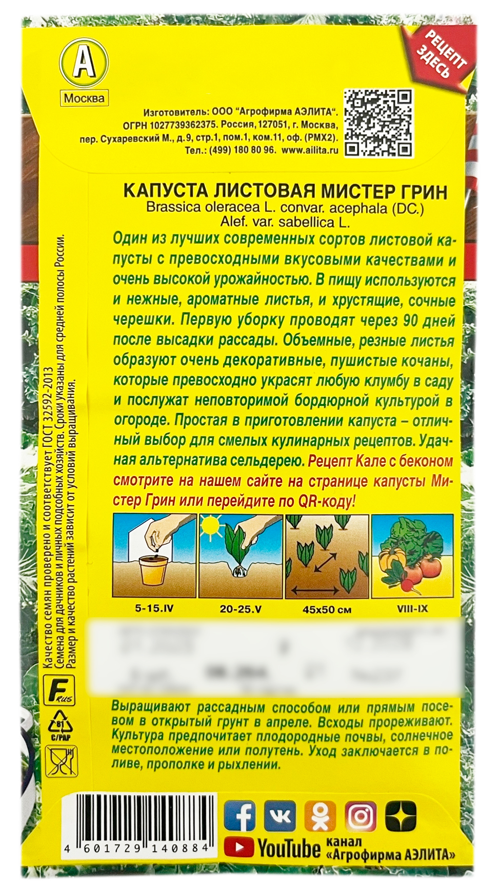 Капуста листовая МИСТЕР ГРИН АЭЛИТАОдин из лучших современных сортов листовой капусты с превосходными вкусовыми качествами и очень высокой урожайностью. В пищу используются и нежные, ароматные листья, и хрустящие, сочные черешки. Первую уборку проводят через 90 дней после высадки рассады. Объемные, резные листья образуют очень декоративные, пушистые кочаны, которые превосходно украсят любую клумбу в саду и послужат неповторимой бордюрной культурой в огороде. Простая в приготовлении капуста – отличный выбор для смелых кулинарных рецептов. Удачная альтернатива сельдерею.