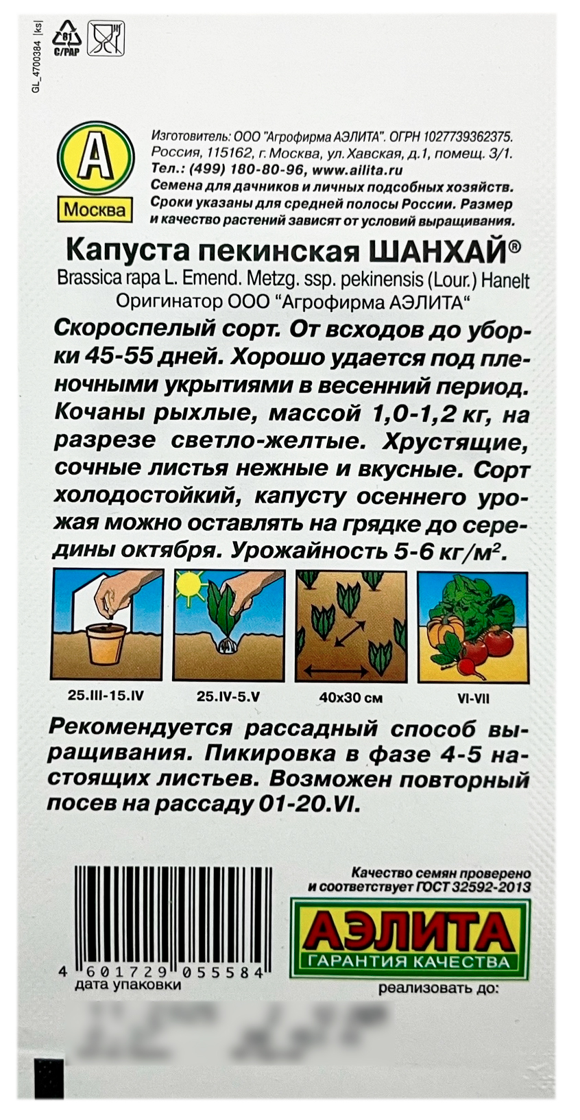 Капуста пекинская ШАНХАЙ АЭЛИТАСкороспелый, высокоурожайный сорт, период от всходов до технической спелости 45-55 дней. Кочаны среднего размера, рыхлые, массой 1,0-1,2 кг. На разрезе светло-желтые, с нежной консистенцией. Вкусовые качества отличные. Рекомендуется для потребления в свежем виде и краткосрочного хранения. Благодаря низкой калорийности и большому количеству нежной клетчатки, листья пекинской капусты очень полезны в диетическом питании для профилактики гипертонии, атеросклероза и ожирения.