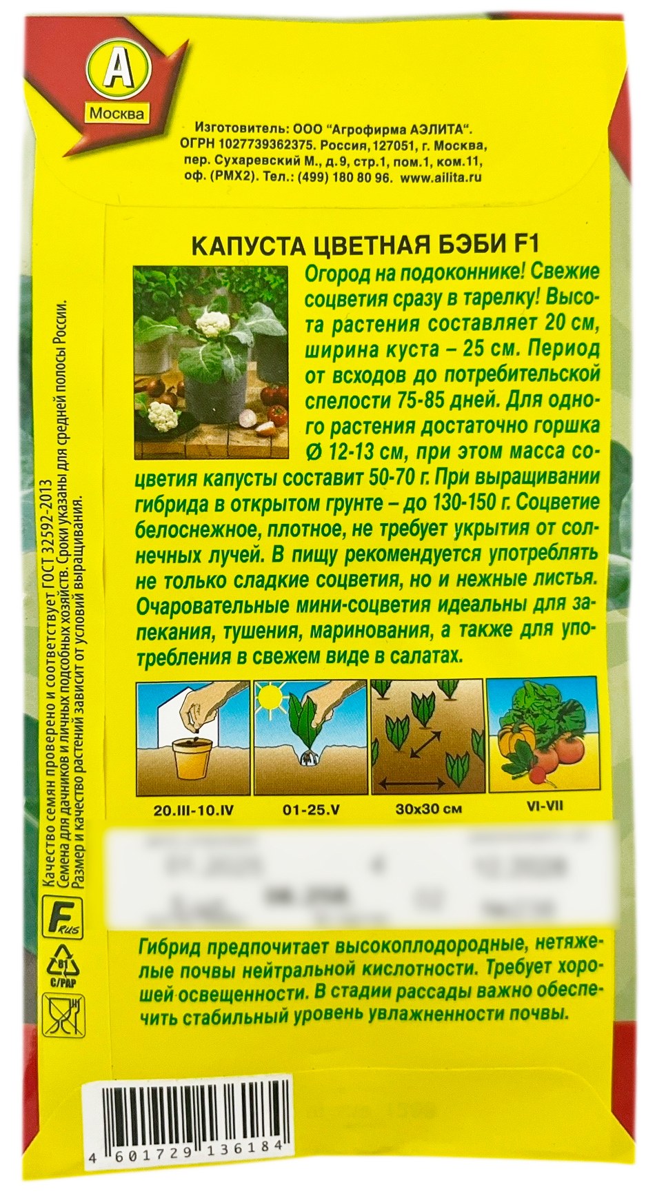 Капуста ЦВЕТНАЯ БЭБИ F1 АЭЛИТАОгород на подоконнике! Свежие соцветия сразу в тарелку! Высота растения составляет 20 см, ширина куста – 25 см. Период от посева до технической спелости 75-85 дней. Для одного растения достаточно горшка Ø 12-13 см, при этом масса соцветия капусты составит 50-70 г. При выращивании гибрида в открытом грунте – до 130-150 г. Соцветие белоснежное, плотное, не требует укрытия от солнечных лучей. В пищу рекомендуется употреблять не только сладкие соцветия, но и нежные листья.