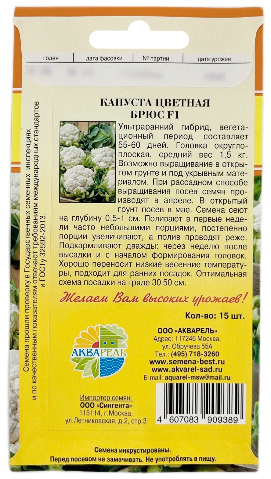 Капуста цветная Брюс F1Ультраранний гибрид, вегетационный период составляет 55-60 дней. Головка округлоплоская, средний вес 1,5 кг. Возможно выращивание в открытом грунте и под укрывным материалом. При рассадном способе выращивания посев семян производят в апреле. В открытый грунт посев в мае. Семена сеют на глубину 0,5-1 см. Поливают в первые недели часто небольшими порциями, постепенно порции увеличивают, а полив проводят реже. Подкармливают дважды: через неделю после высадки и с началом формирования головок. Хорошо переносит низкие весенние температуры, подходит для ранних посадок. Оптимальная схема посадки на гряде 30х50 см.