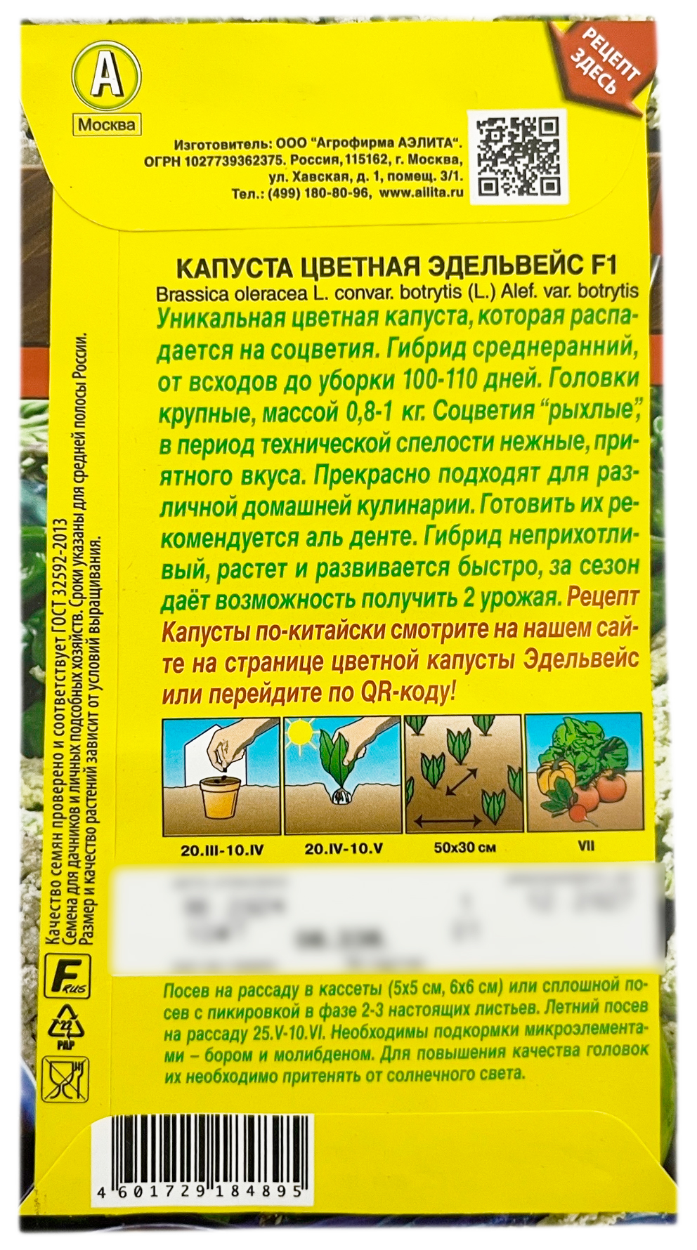 Капуста цветная ЭДЕЛЬВЕЙС F1 АЭЛИТАУникальная цветная капуста, которая распадается на соцветия. Гибрид среднеранний, от всходов до уборки 100-110 дней. Головки крупные, массой 0,8-1 кг. Соцветия “рыхлые”, в период технической спелости нежные, приятного вкуса. Прекрасно подходят для различной домашней кулинарии. Готовить их рекомендуется альденте. Гибрид неприхотливый, растет и развивается быстро, за сезон даёт возможность получить 2 урожая.