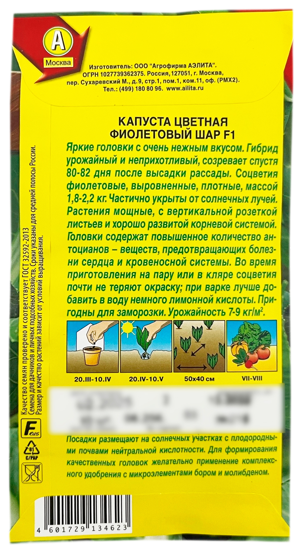 Капуста цветная ФИОЛЕТОВЫЙ ШАР F1 АЭЛИТАЯркие головки с очень нежным вкусом. Гибрид урожайный и неприхотливый, созревает спустя 80-82 дня после высадки рассады. Соцветия фиолетовые, выровненные, плотные, массой 1,8-2,2 кг. Частично укрыты от солнечных лучей. Растения мощные, с вертикальной розеткой листьев и хорошо развитой корневой системой. Головки содержат повышенное количество антоцианов - веществ, предотвращающих болезни сердца и кровеносной системы. Во время приготовления на пару или в кляре соцветия почти не теряют окраску; при варке лучше добавить в воду немного лимонной кислоты. Пригодны для заморозки.