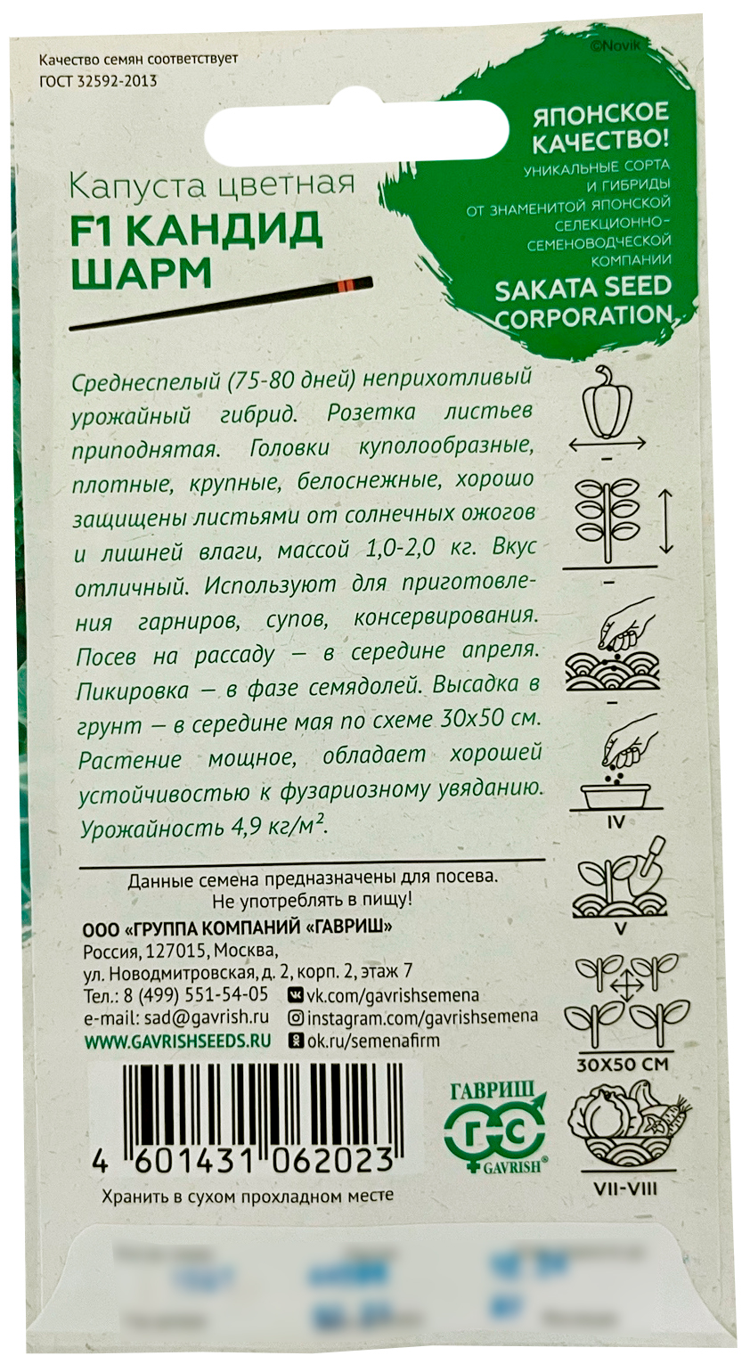 Капуста цветная Кандид Шарм F1 СакатаСреднеранний (75-80 дней) неприхотливый урожайный гибрид. Розетка листьев приподнятая. Головки куполообразные, плотные, крупные, белоснежные, хорошо защищены листьями от солнечных ожогов и лишней влаги, массой 1,0-2,0 кг. Вкус отличный. Используют для приготовления гарниров, супов, консервирования. Посев на рассаду - в середине апреля. Пикировка - в фазе семядолей. Высадка в грунт - в середине мая по схеме 30х50 см. Растение мощное, обладает хорошей устойчивостью к фузариозному увяданию. Урожайность 4,9 кг/м².