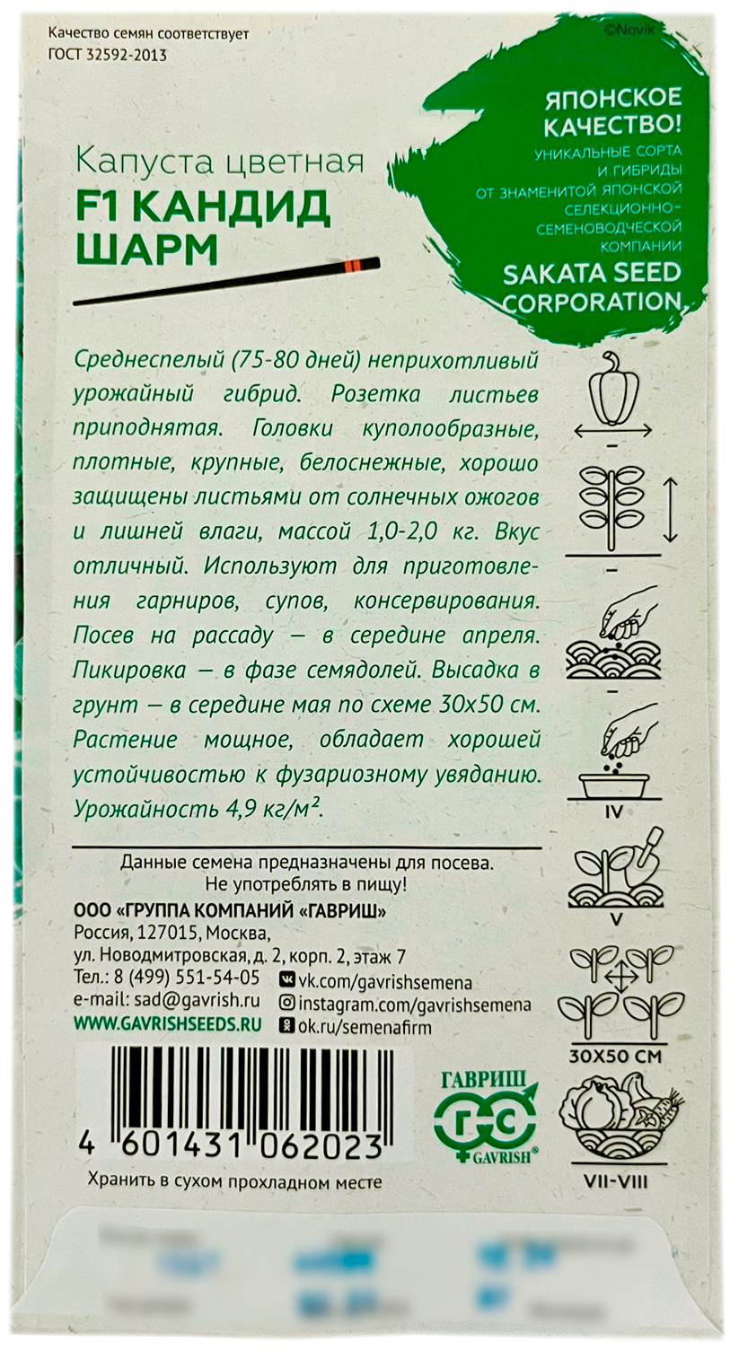Капуста цветная КАНДИД ШАРМ F1 ГАВРИШСреднеранний (75-80 дней) неприхотливый урожайный гибрид. Розетка листьев приподнятая. Головки куполообразные, плотные, крупные, белоснежные, хорошо защищены листьями от солнечных ожогов и лишней влаги, массой 1,0-2,0 кг. Вкус отличный. Используют для приготовления гарниров, супов, консервирования. Посев на рассаду - в середине апреля. Пикировка - в фазе семядолей. Высадка в грунт - в середине мая по схеме 30х50 см. Растение мощное, обладает хорошей устойчивостью к фузариозному увяданию.