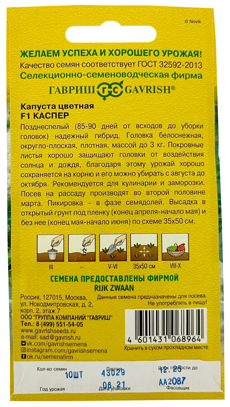 Капуста цветная КасперСреднеранний (120-130 дней от всходов до уборки головок) надежный гибрид. Головка белоснежная, округло-плоская, плотная, массой до 3 кг. Покровные листья хорошо защищают головки от воздействия солнца и дождя, благодаря этому урожай хорошо сохраняется на корню и его можно убирать с августа до октября. Рекомендуется для кулинарии и заморозки. Посев на рассаду производят во второй половине марта. Пикировку – в фазе семядолей. Высадку в открытый грунт под пленку (конец апреля – начало мая) и без нее (конец мая – начало июня) по схеме 35х50 см.