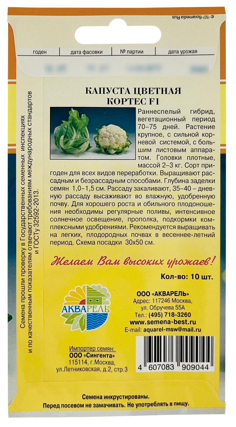 Капуста цветная Кортес F1Раннеспелый гибрид, вегетационный период 70-75 дней. Растение крупное, с сильной корневой системой, с большим листовым аппаратом. Головки плотные, массой 2-3 кг. Сорт пригоден для всех видов переработки. Выращивают рассадным и безрассадным способами. Глубина заделки семян 1,0-1,5 см. Рассаду закаливают, 35-40 – дневную рассаду высаживают во влажную, удобренную почву. Для хорошего роста и обильного плодоношения необходимы регулярные поливы, интенсивное солнечное освещение, прополка, подкормки комплексными удобрениями. Рекомендуется выращивать на легких, плодородных почвах в весеннее-летний период. Схема посадки 30х50 см.
