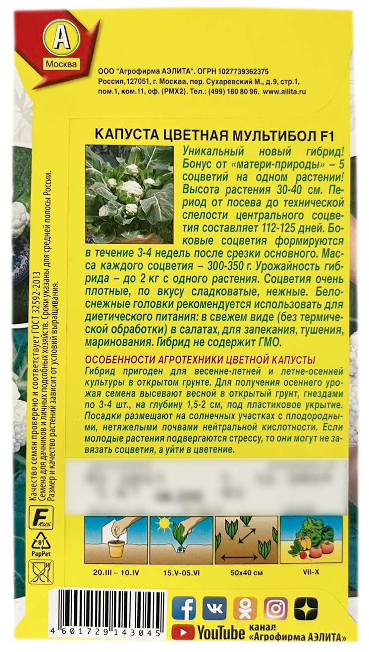 Капуста цветная МУЛЬТИБОЛ F1 АЭЛИТАУникальный новый гибрид! Бонус от «матери-природы» – 5 соцветий на одном растении! Высота растения 30-40 см. Период от посева до технической спелости центрального соцветия составляет 112-125 дней. Боковые соцветия формируются в течение 3-4 недель после срезки основного. Масса каждого соцветия – 300-350 г. Урожайность гибрида – до 2 кг с одного растения. Соцветия очень плотные, по вкусу сладковатые, нежные. Белоснежные головки рекомендуется использовать для диетического питания: в свежем виде (без термической обработки) в салатах, для запекания, тушения, маринования. Гибрид не содержит ГМО.