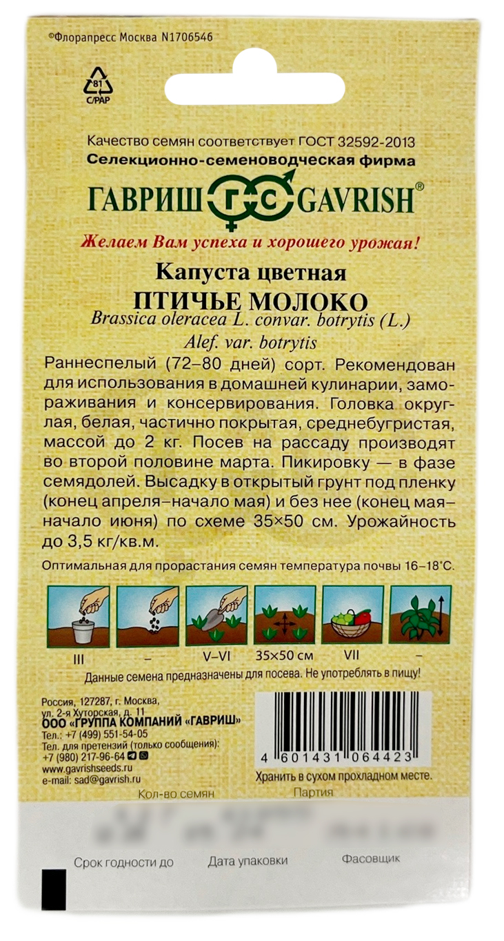 Капуста цветная ПТИЧЬЕ МОЛОКО ГАВРИШРаннеспелый (72-80 дней) сорт. Рекомендован для использования в домашней кулинарии, замораживания и консервирования. Головка округлая, белая, частично покрытая, среднебугристая, массой до 2 кг. Посев на рассаду производят во второй половине марта. Пикировку – в фазе семядолей. Высадку в открытый грунт под пленку (конец апреля – начало мая) и без нее (конец мая – начало июня) по схеме 35х50 см. Урожайность до 3,5 кг/кв.м.