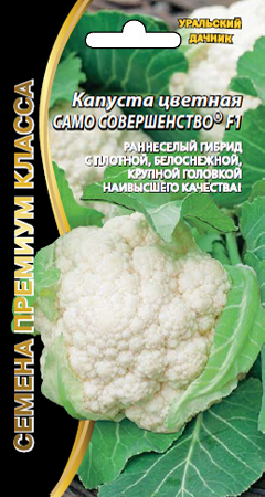 Капуста цветная Само совершенство F1 - раннеспелый гибрид: от высадки рассады до сбора урожая 70-75 дней. Головки отличного качества: чистобелые, крепкие, не рассыпаются, массой до 950 г. Внутренние листья хорошо закрывают головку, благодаря чему не требуется дополнительных усилий для ее отбеливания.Пригоден для получения ранней продукции летом и осеннего урожая в областях с умеренным климатом.