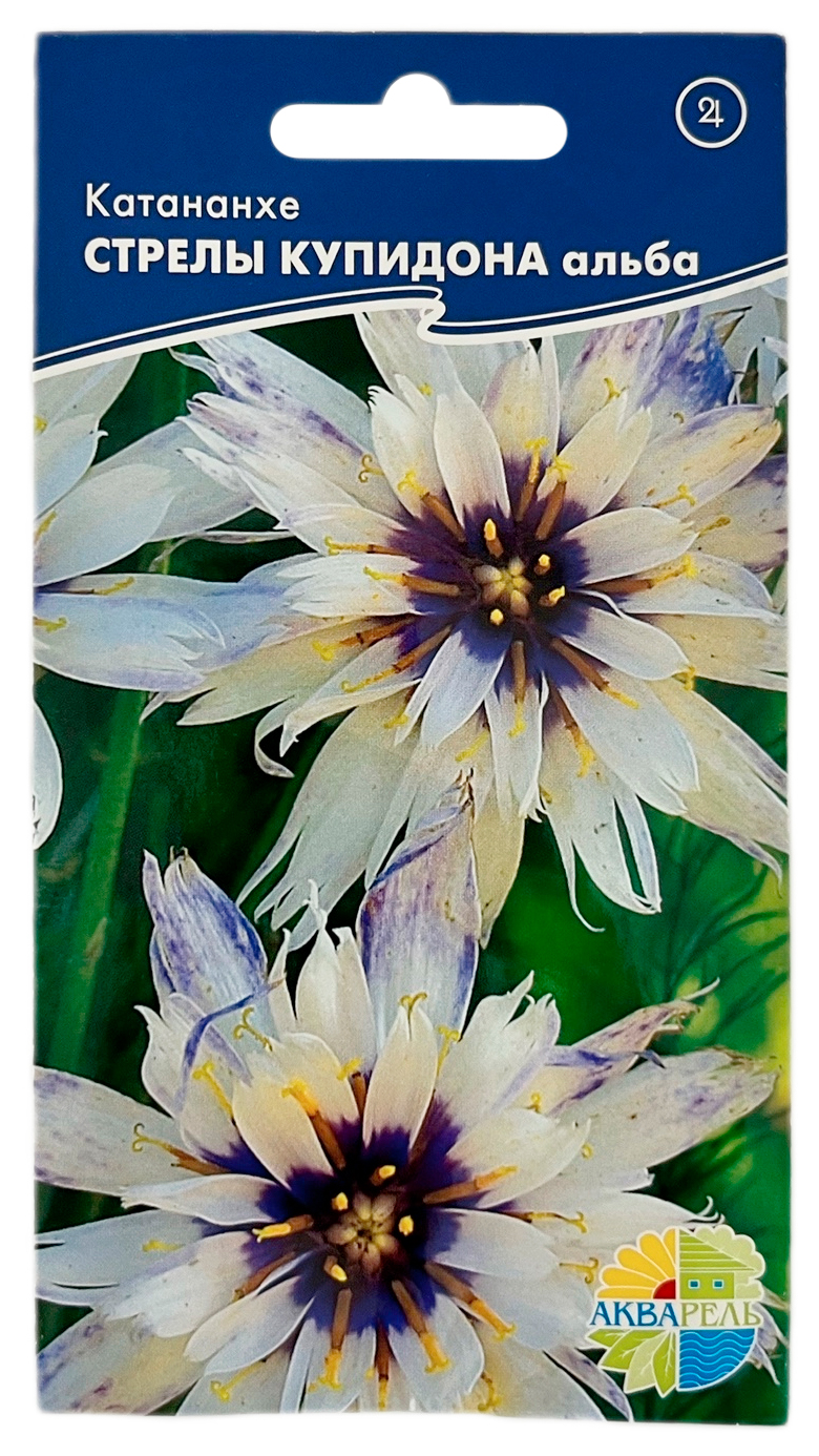 Катананхе СТРЕЛЫ КУПИДОНА альба АКВАРЕЛЬЭффектное растение с прямостоячим стеблем высотой около 60 см. На верхушках безлистных цветоносов находятся соцветия-корзинки диаметром 4 см, . Используют для посадок в клумбах, бордюрах, в миксбордерах среди ковровых растений. Срезанные соцветия подходят для букетных композиций, как в свежем, так и в засушенном виде для зимних букетов.
