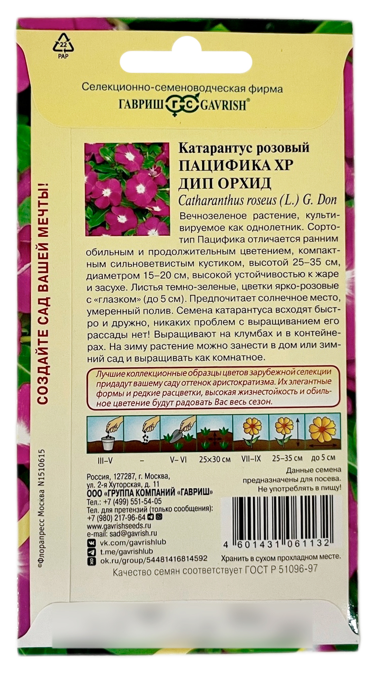 Катарантус розовый ПАЦИФИКА ХР ДИП ОРХИД ГАВРИШКрупноцветковое, компактное, сильноветвистое растение, не требует формировки, высотой 25-35 см, диаметром 15-20 см. Цветки розовые, диаметром 5 см. Высокоустойчив к жаре и засухе. Выращивают на клумбах и в контейнерах.