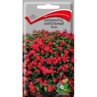 Описание Катарантус ТитанКатарантус ампельный Титан - это эффектное ампельное растение. Длина побегов 50-75 см. Обильно цветущие кустики высотой 10-15 см. Листья тёмно-зелёные, овальные. Цветки красные. Используют для украшения балконов, лоджий, в подвесных корзинах, кашпо.
