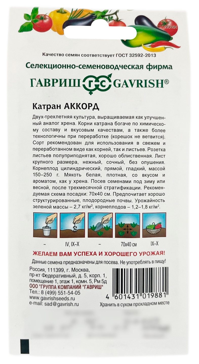 Катран АККОРД ГАВРИШДвух-трехлетняя культура, выращиваемая как улучшенный аналог хрена. Корни катрана богаче по химическому составу и вкусовым качествам, а также более технологичны при переработке (корешок не ветвится). Сорт рекомендован для использования в свежем и переработанном виде, как корней так и листьев. Розетка листьев полуприподнятая, хорошо облиственная. Лист крупного размера, нежный, сочный, без опушения. Корнеплод цилиндрический, прямой, гладкий , массой 150-250 г. Мякоть белая, плотная, со вкусом и ароматом как у хрена. Посев семенами под зиму или весной после 3-х месячной стратификации. Рекомендуемая схема посадки – 70х40см. Предпочитает хорошо структурированные, плодородные почвы.