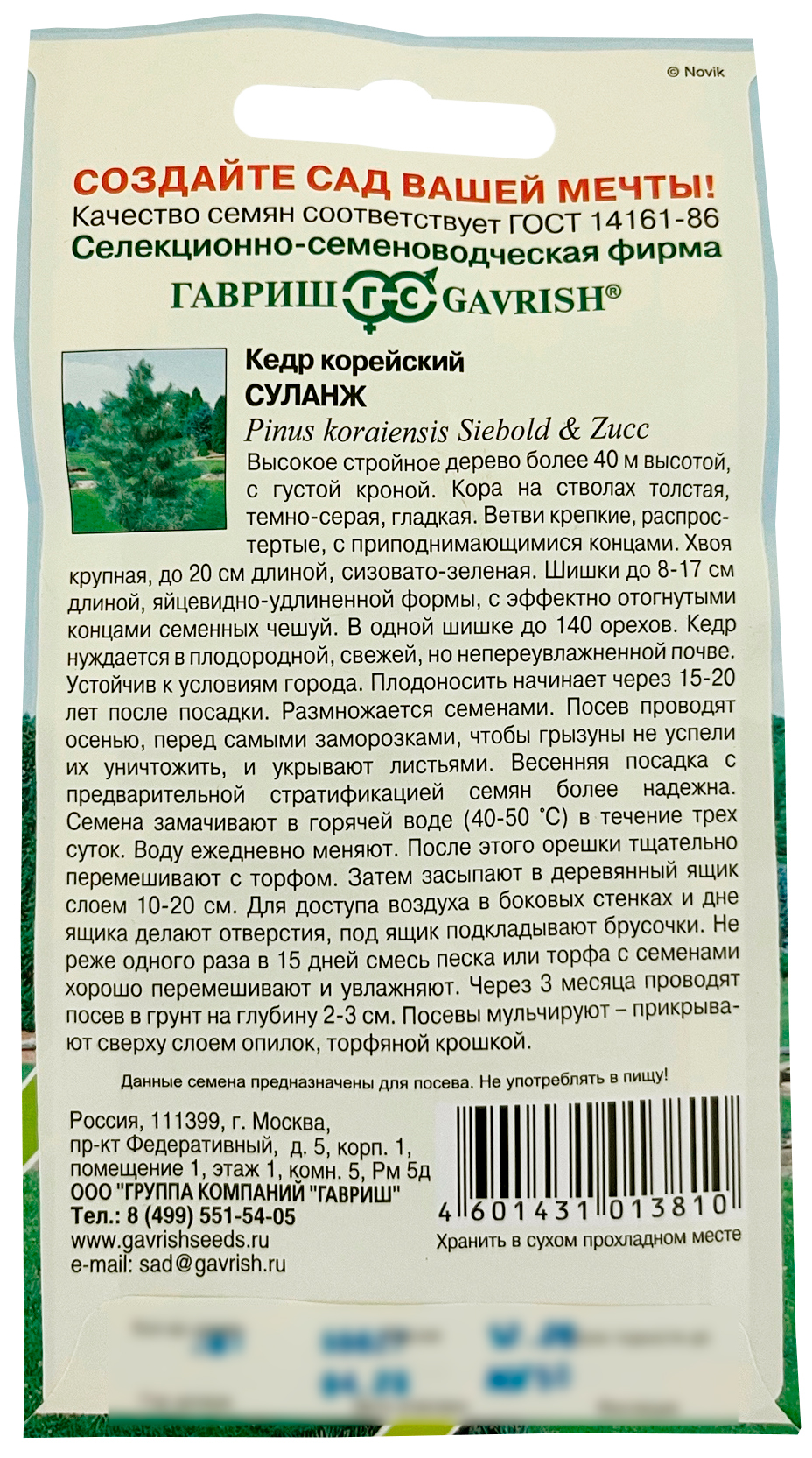 Кедр корейский Суланж ГАВРИШВысокое, стройное дерево более 40 м высотой с густой кроной. Кора на стволах толстая, темно-серая, гладкая. Ветви крепкие, распростертые с приподнимающимися концами. Хвоя крупная, до 20 см длиной, сизовато-зеленая. Шишки до 8-17 см длиной, яйцевидно-удлиненной формы с эффектно отогнутыми концами семенных чешуй. В одной шишке — до 140 орехов. Сосна нуждается в плодородной, свежей, но не переувлажненной почве. Устойчива к условиям города. Плодоносить начинает через 15-20 лет после посадки. Размножается семенами. Посев проводят осенью, перед самыми заморозками, чтобы грызуны не успели их уничтожить, и укрывают листьями. Весенняя посадка с предварительной стратификацией семян более надежна. Семена сначала протравливают: опускают на 2 часа в полупроцентный раствор марганцовокислого калия. Затем замачивают в горячей воде (40-50 °С) в течение трех суток. Воду ежедневно меняют. После этого орешки тщательно перемешивают с торфом. Затем засыпают в деревянный ящик слоем 10-20 см. Для доступа воздуха в боковых стенках и дне ящика делают отверстия, под ящик подкладывают брусочки. Не реже одного раза в 15 дней смесь песка или торфа с семенами хорошо перемешивают и увлажняют. Спустя 3 месяц проводят посев в грунт на глубину 2-3 см. Посевы мульчируют – прикрывают сверху слоем опилок, торфяной крошкой.