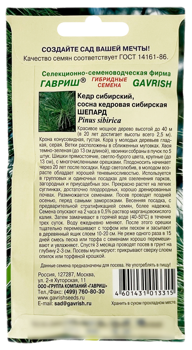 Кедр сибирский сосна кедровая сибирская ШЕПАРД ГАВРИШКрасивое мощное дерево высотой до 40 м. Крона конусовидная, густая, кора у молодых деревьев гладкая, серая. Ветки расположены в сближенных мутовках. Хвоя темно-зеленая, до 13 см длиной, хвоинки собраны по 5 штук в пучках. Продолжительность жизни хвои 5-6 лет. Шишки прямостоячие, светло-бурого цвета, крупные, до 13 см длиной, с многочисленными орешками. Растет очень медленно, особенно в первые 5 лет. В 20 лет достигает высоты всего 2,5 м. Плодоносить начинает через 20 лет после посадки. Прекрасно растет на легких суглинках, достаточно плодородных, с хорошим дренированием. Светолюбив, в молодом возрасте обладает хорошей теневыносливостью, отлично развиваясь под кронами деревьев.