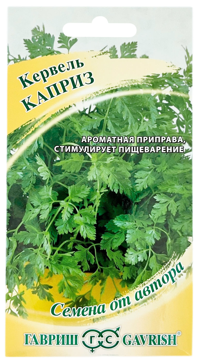 Кервель Каприз ГАВРИШОднолетнее холодостойкое пряное и лекарственное растение с приятным ароматом. Содержит минеральные соли, аскорбиновую кислоту, каротин, рутин. Стебель цилиндрический, ветвистый, до 45-70 см. Цветет в мае-августе. Кервель употребляют при сыпи, ушибах, при расстройстве желудка, для стимулирования органов пищеварения, рекомендуют для диетического питания при заболеваниях печени, желчного пузыря, почек. Благодаря нежному аромату, растение широко используют в кулинарии. Свежие и сушеные листья, собранные до цветения — прекрасная приправа к салатам, мясным блюдам и супам. Выращивают в полутени с весны до осени, высевая через 2-3 недели. Семена высевают в рядки на глубину 1-2 см. Всходы появляются через 12-16 дней, молодую зелень убирают через шесть-восемь недель после посева, срезая ее на высоте 10-15 см от поверхности почвы. Для повышения урожайности листьев срезают цветоносные стебли.